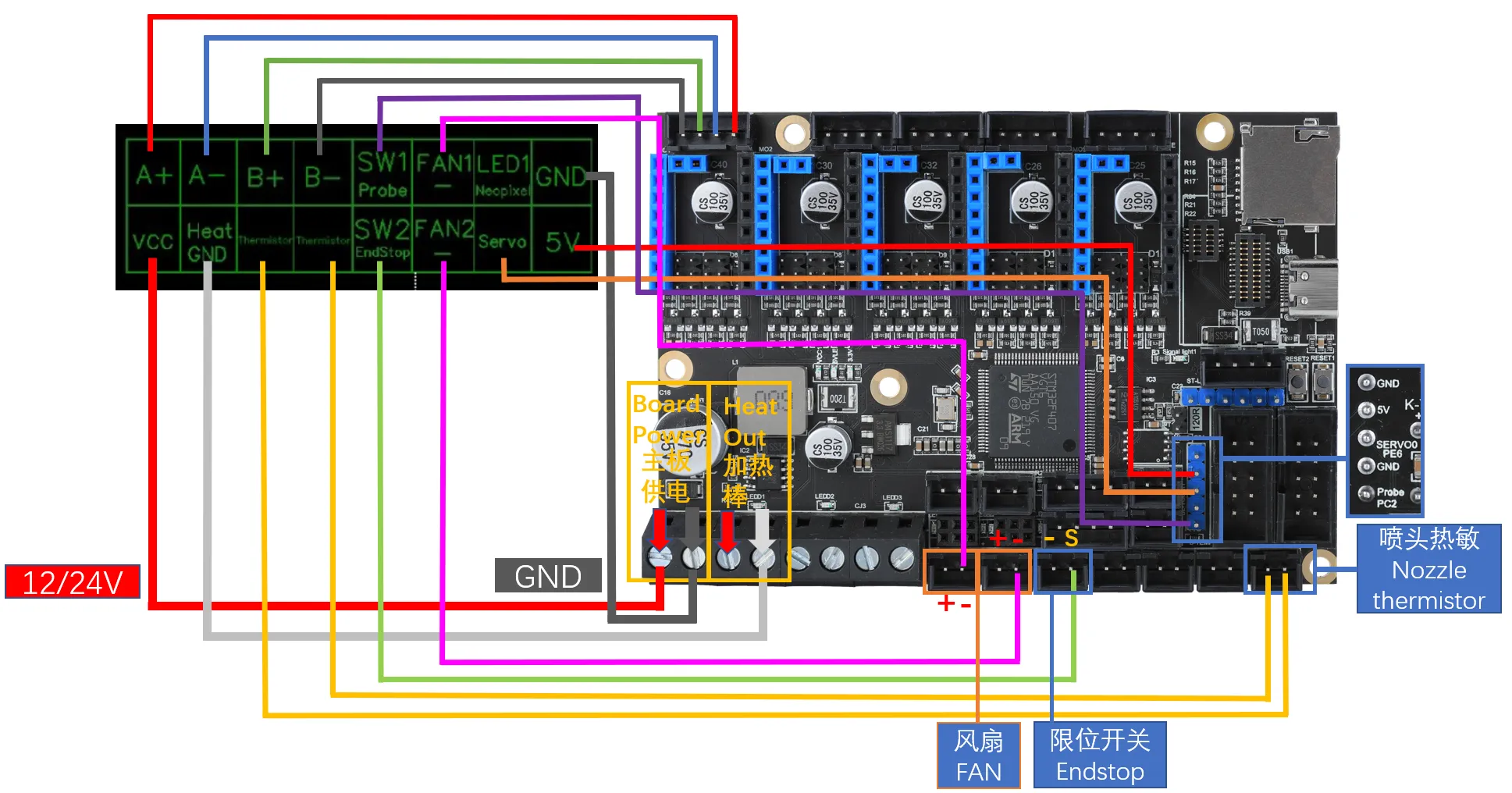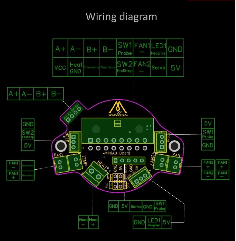 模块 & 扩展板类FLY-MiniAB 集线板简介本页总览FLY-MiniAB集线板 接线说明 提示 本教程以E3V2为例 风扇说明 VCC对应风扇接法,如果使用5V风扇请将跳线移动到上方 Loading...
